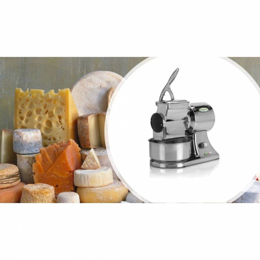 Τυροτρίφτης κύλινδρος με ρελέ ασφαλείας και κάδο inox για την συλλογή τυριού. Iδανικό μηχάνημα για γρήγορο, ασφαλές τρίψιμο παρμεζάνας και άλλων σκληρών τυριών. Κατασκευασμένο στην Ιταλία από υψηλής ποιότητας γυαλισμένο αλουμίνιο και με ισχυρό, γαλβανισμένο κύλινδρο μεγάλης αντοχής. Παρέχει προστασία από υπερφόρτωση στον κινητήρα και λειτουργεί στις 1400 στροφές. Ιδανικός για Super Market, Delicatessen, Εστιατόρια. Μετατρέπει τα σκληρά τυριά σε σκόνη.